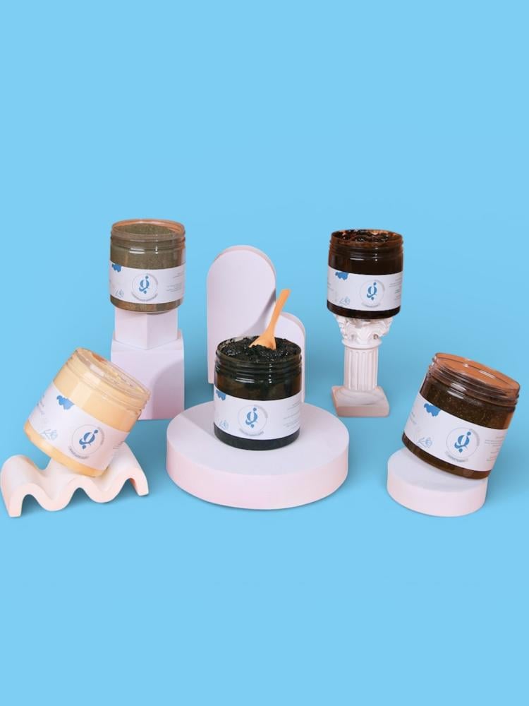 • مقشر القهوة والأعشاب يزيل الجلد الميت ويعزز تجدد الخلايا، مما يجعل البشرة جاهزة لوضع باقي المنتجات.